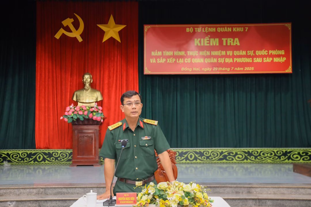 Ngày 29/7, một đoàn công tác từ Bộ Tư lệnh Quân khu 7, do Đại tá Nguyễn Ngọc Kiên, Phó Tham mưu trưởng Quân khu, dẫn đầu đã thực hiện chuyến công tác kiểm tra tình hình thực hiện nhiệm vụ quân sự – quốc phòng và sắp xếp lại cơ quan quân sự địa phương sau sáp nhập tại Ban Chỉ huy Phòng thủ khu vực (PTKV) 3 – Đồng Xoài, thuộc Bộ Chỉ huy Quân sự (CHQS) tỉnh Đồng Nai. Đi cùng đoàn công tác có Đại tá Trần Đức Thắng, Phó Chủ nhiệm Chính trị Quân khu; Đại tá Lê Chí Dũng, Phó Chủ nhiệm Hậu cần – Kỹ thuật Quân khu, cùng các thủ trưởng Bộ CHQS tỉnh Đồng Nai và các ngành chức năng của Quân khu.