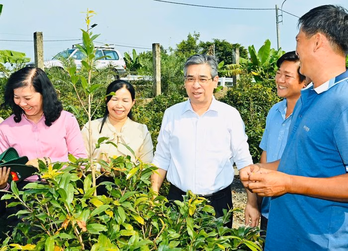 Đồng chí Nguyễn Phước Lộc ghi nhận nỗ lực của nông dân trong việc ứng dụng khoa học – công nghệ để có sản phẩm mai trái mùa, phục vụ Đại lễ Vesak Liên Hiệp Quốc năm 2025.