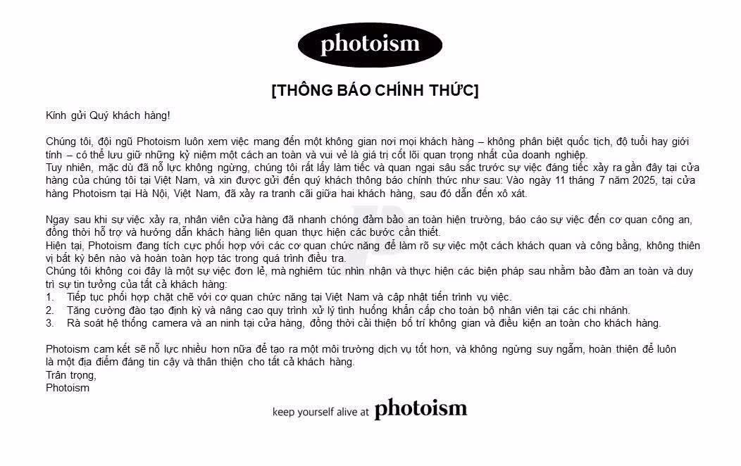 Theo thông báo chính thức được đăng tải trên fanpage của Photoism vào chiều tối ngày 14/7, sự việc xô xát xảy ra vào ngày 11/7. Trong thông báo, Photoism bày tỏ sự quan ngại sâu sắc về vụ việc và khẳng định nhân viên của họ đã nhanh chóng xử lý tình hình, báo cáo với lực lượng chức năng và hỗ trợ các bên liên quan. Cửa hàng này cũng cam kết sẽ hợp tác đầy đủ với cơ quan chức năng để làm rõ vụ việc và thực hiện nhiều biện pháp để đảm bảo an toàn và duy trì niềm tin của khách hàng.