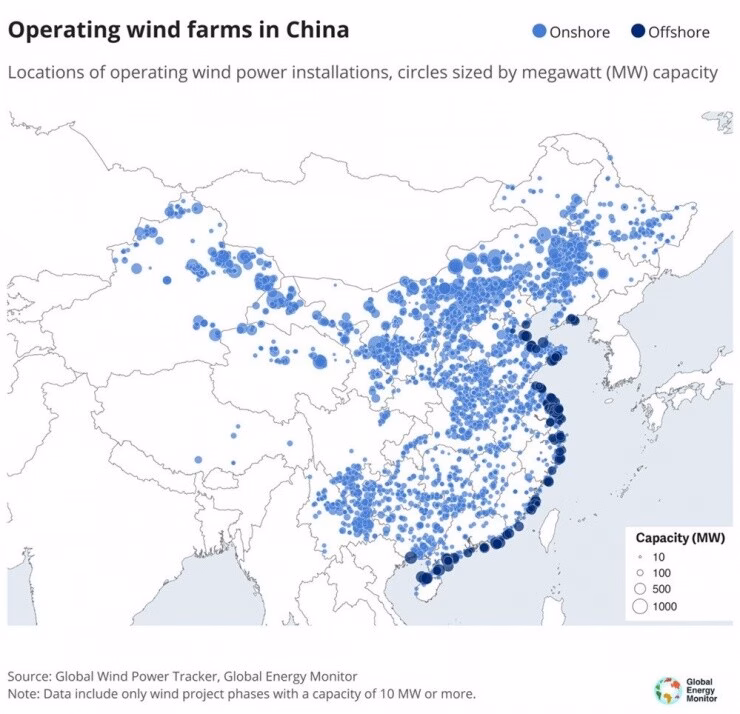 Điện gió ngoài khơi đang trở thành một trụ cột quan trọng trong chiến lược năng lượng tái tạo của Trung Quốc. Công suất điện gió ngoài khơi đã tăng vọt lên 42,7 GW vào tháng 3/2025, chiếm hơn một nửa công suất đang xây dựng trên toàn cầu. Các tỉnh ven biển như Giang Tô và Quảng Đông dẫn đầu với hơn 50% công suất điện gió ngoài khơi đã lắp đặt. Sự phát triển này không chỉ giúp Trung Quốc tận dụng tài nguyên năng lượng tái tạo mà còn đóng góp vào việc giảm thiểu tác động môi trường.