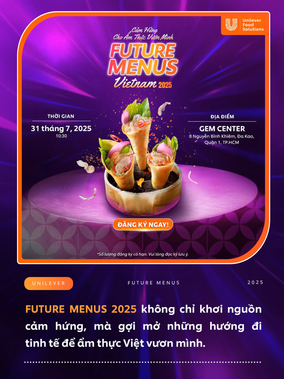Ngày 31/7/2025, tại TP.HCM, Unilever Food Solutions đã tổ chức sự kiện Future Menus 2025, một sự kiện quan trọng và nổi bật trong ngành ẩm thực tại Việt Nam. Sự kiện này đã quy tụ đông đảo các đầu bếp chuyên nghiệp, chủ nhà hàng và các thương hiệu chiến lược trong ngành F&B (kinh doanh thực phẩm và đồ uống).